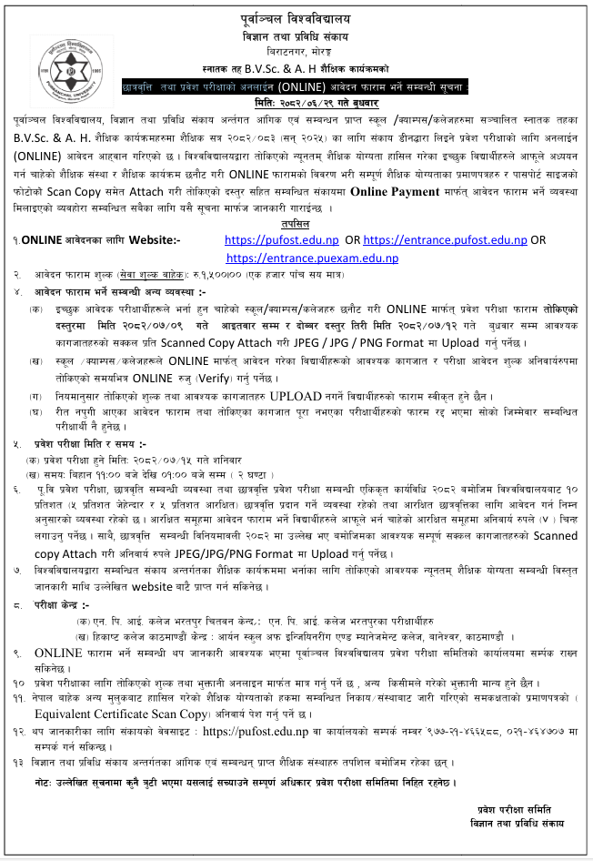 स्नातक तह B.V.Sc. & A. H शैक्षिक कार्यक्रमको छात्रवृत्ति तथा प्रवेश परिक्षाको अनलाईन फाराम भर्ने सम्बन्धमा